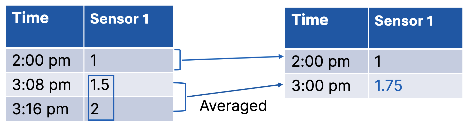 The sampling interval is the amount of time between two consecutive data points in a time series used for the analysis. It averages each sensor's data over each period independently.The example below shows a sampling interval set to 1 hour.