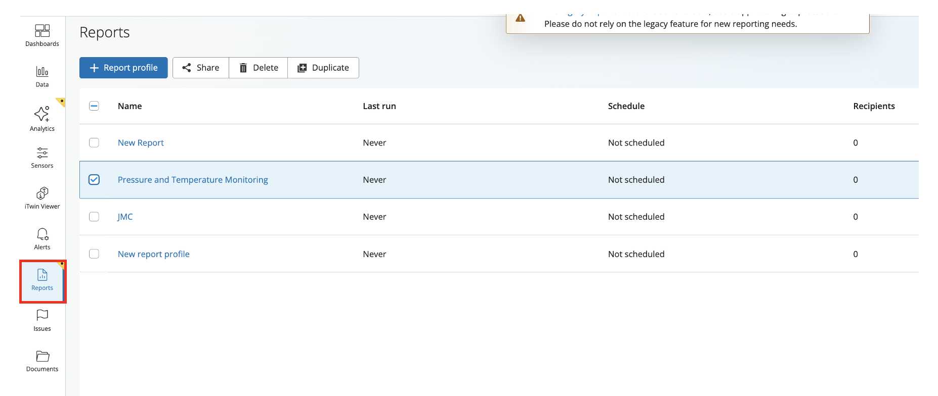 2. Duplicate or Delete Options- You can select from duplicate or delete buttons at the top of the page. The Duplicate button will take you directly into a newly created copy of the report for editing. The Delete option will provide you with a deletion confirmation popout you must accept before the report is permanently deleted.