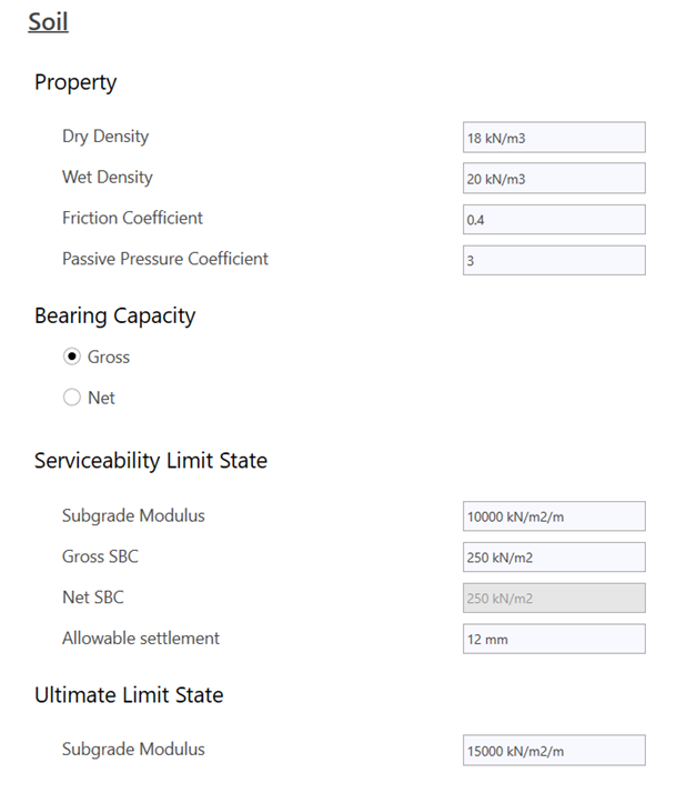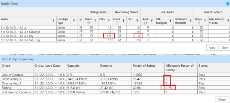 - Extended control for stability checks: Allows specifying individual sliding and overturning factors of safety for stability checks for each load combination. The previous versions only allowed one value each for sliding and overturning for all load combinations.