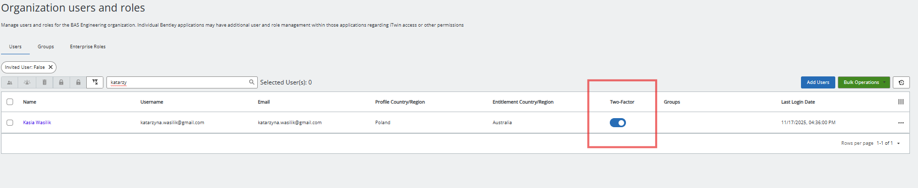Bentley offers free to use MFA utilizing Ping ID services. Until now Bentley offered MFA to be enforced on specific domains only. From now on Admins and co-admin are able to apply MFA on a specific user within User Management.