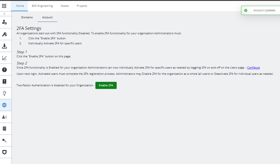 Before Administrator can apply MFA to a specific user, 2FA for account must be enabled in User Management.