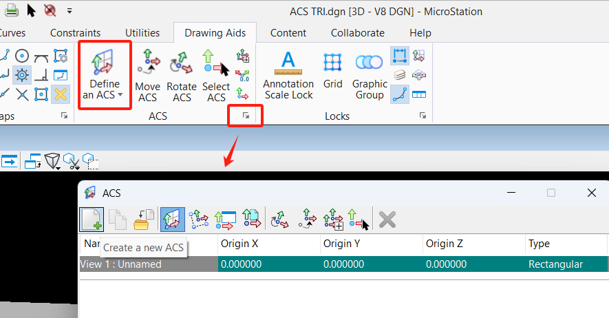 1. 点击工作流Drawing> Drawing Aids> ACS,打开ACS对话框;