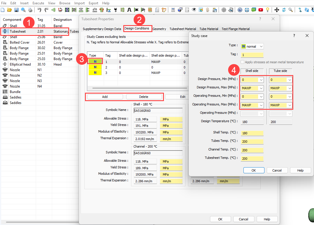 To enable / disable Differential Pressure Design, double left mouse click on the respective tubesheet in the component column to the left. After the dialog opens, choose Supplemental Design Data tab> Design Conditions area> Enable / Disable option for "Use Differential Pressure Design" option.
