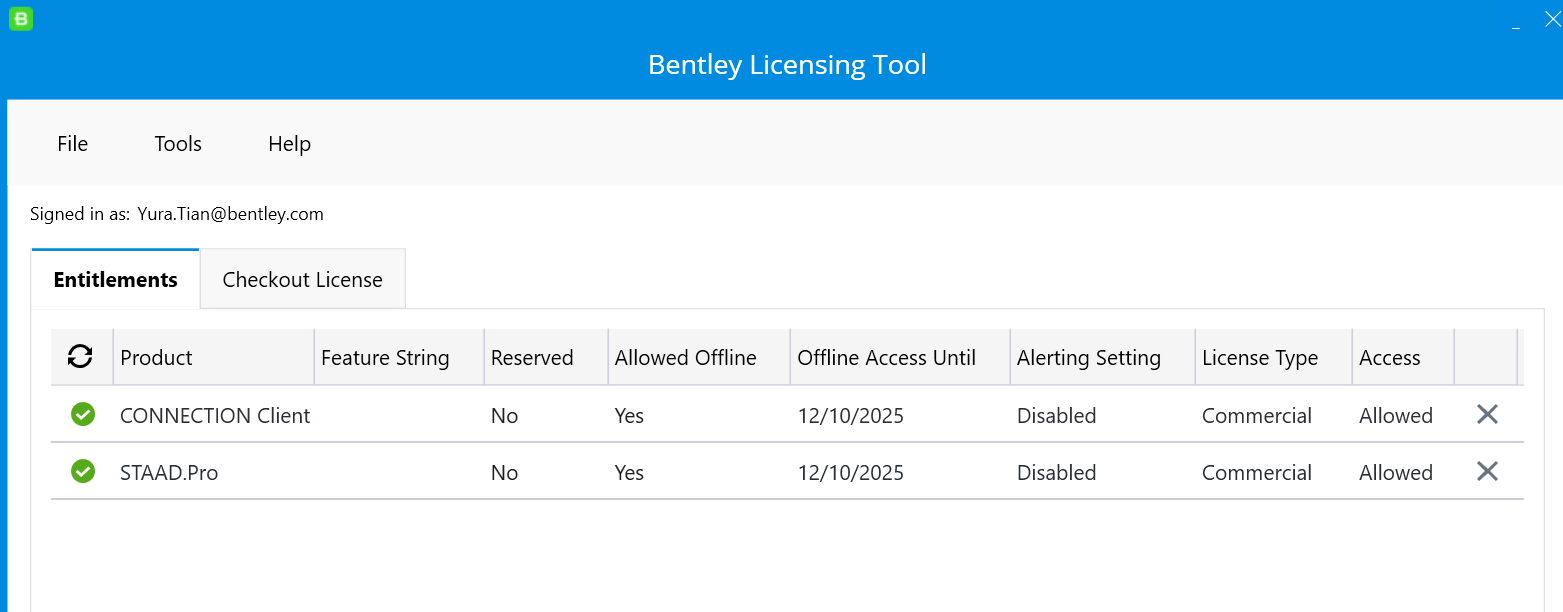 4. 您可通过 Bentley Licensing Tool 核实许可激活状态。由于当前是使用 STAAD.Pro 许可启动 STAAD Foundation Advanced 软件,因此在许可工具中,产品状态将显示为 “STAAD.Pro 已激活”。