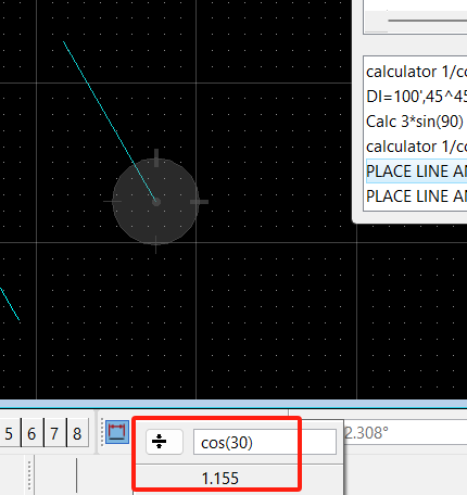 5.输入除号后会显示下面截图中的除号后边的输入框,输入cos(30),底下会显示计算结果1.155,这就是斜边的长度,按键盘上的回车键,点击视图空白处任意一点,斜边就放置好了: