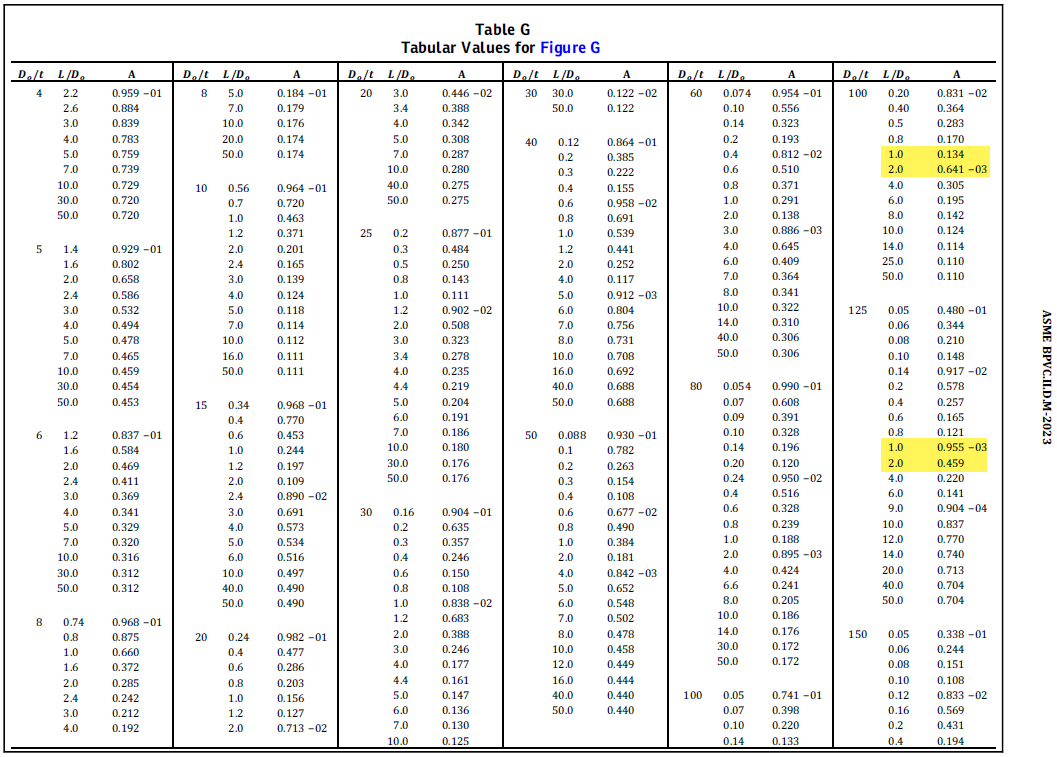 - Refer to Table G using the ratios L/Do and Do/t to obtain Factor A.