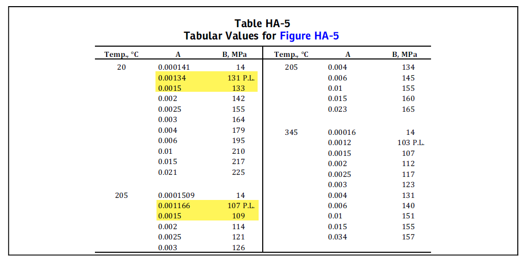 - Using ASME Section II, Part D, Subpart 3 (e.g., Table HA‑5), find Factor B corresponding to your Factor A and design temperature.