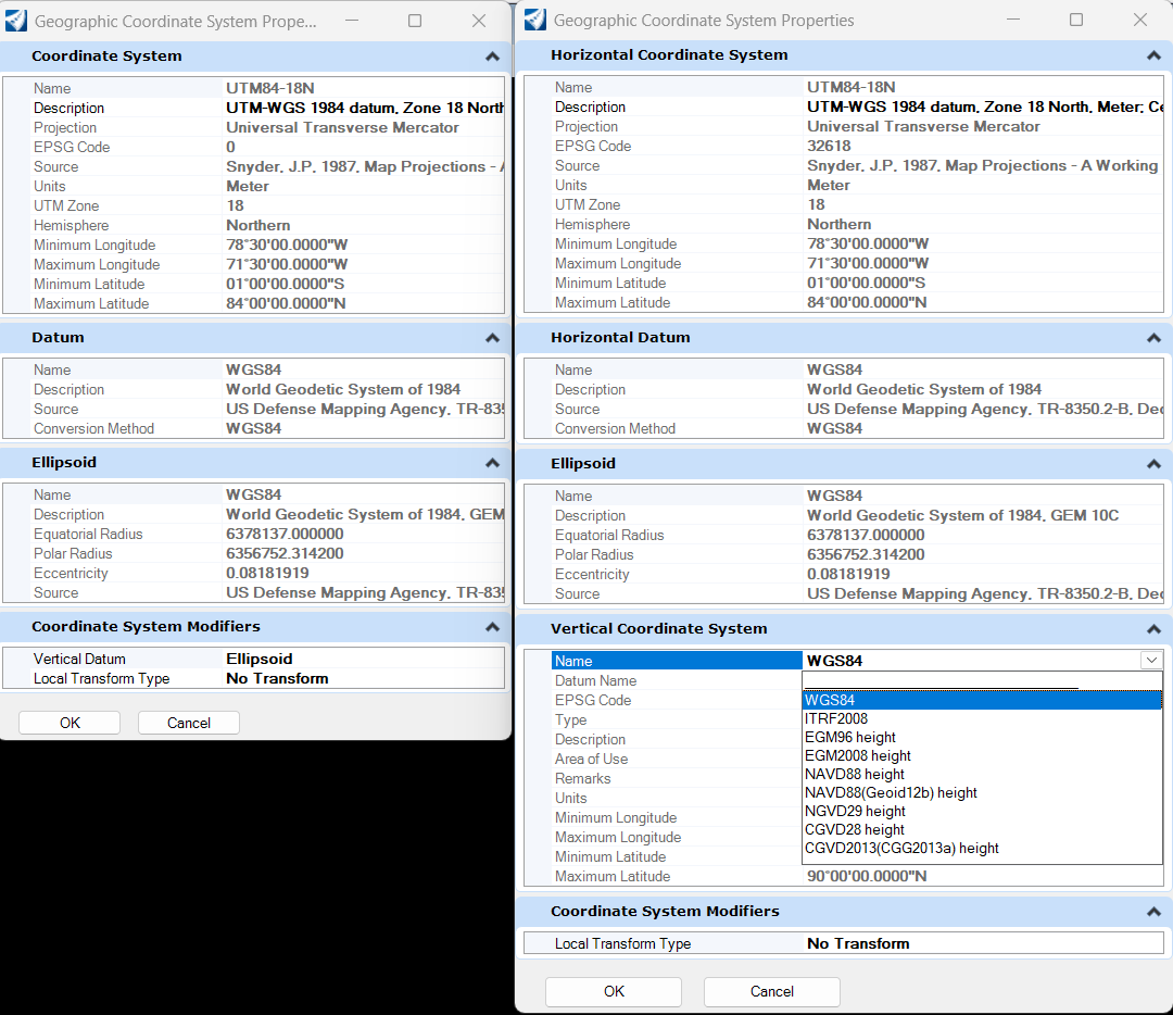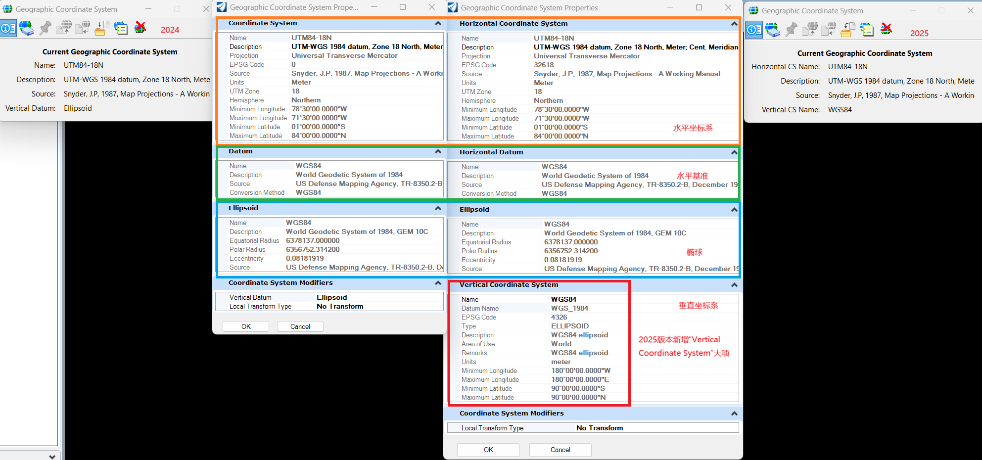 2025版本坐标系属性新增独立“Vertical Coordinate System”大项,将垂直相关参数单独拆分,补充了名称、基准名称、EPSG编码、适用区域等关键信息,形成完整的垂直坐标系模块。而且选择水平坐标系后,可为垂直坐标系选择命名基准(Named Datums)。之前的版本仅在“Coordinate System Modifiers”中简略标注“Vertical Datum: Ellipsoid”,未明确垂直坐标系的完整属性。