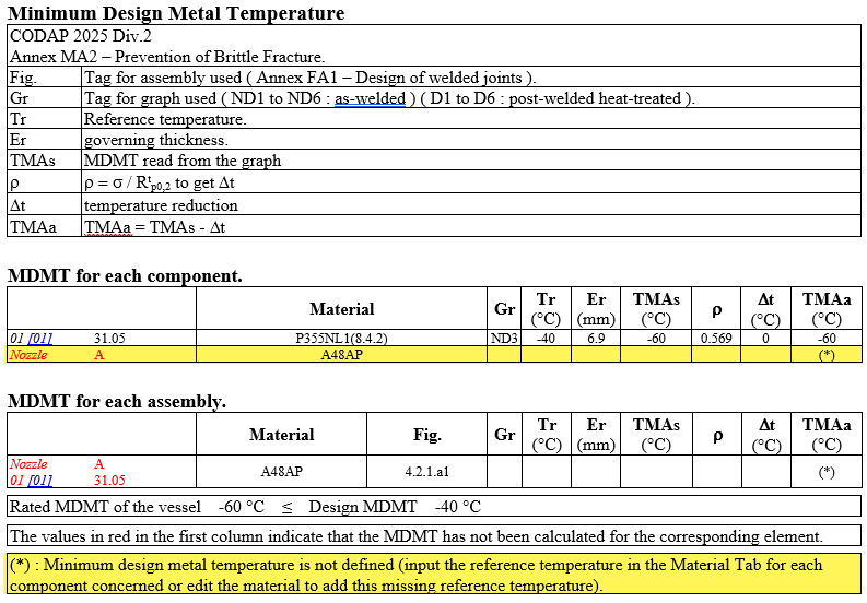 For example, the report shows that MDMT is calculated for the shell material P355NL1, but not for the nozzle material A48AP.