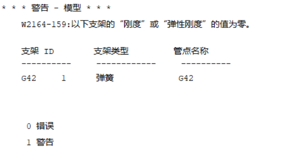 这只是一个警告,用于提醒用户:列出的指定支撑的弹簧刚度值为 0.00。换句话说,在特定类型支撑的承载方向上,将不会有约束支撑力;就好像该支撑在该方向上不存在一样(无论其他支撑设置如何)。