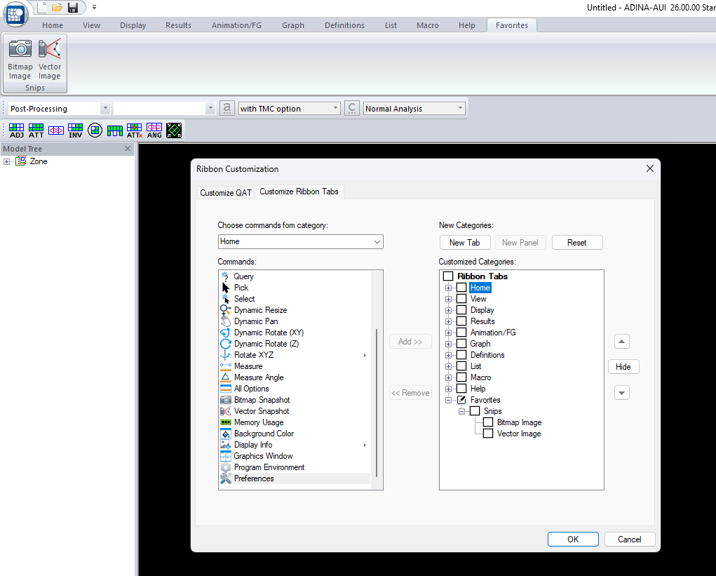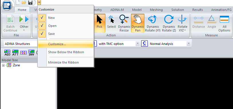 Each mode in the Program Module drop-down list (ADINA Structures, ADINA Thermal, ADINA CFD, ADINA EM, and Post Processing) has an independent ribbon menu configuration. If you want the same commands to appear in both Structures and Post-Processing modules, for example, repeat the same steps for each mode.