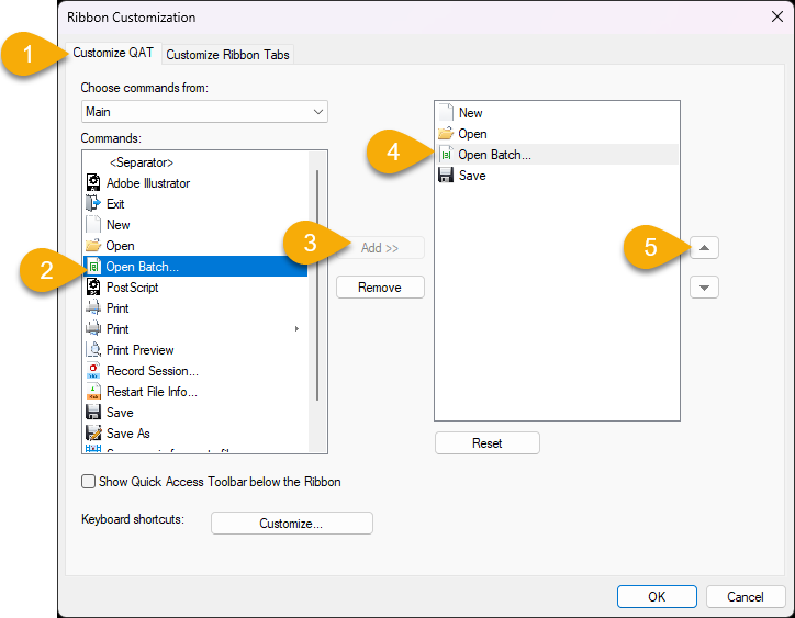 An option to customize the Ribbon menu has been added to the program. Access the customization from the Quick Access Toolbar (QAT) drop down or right-click anywhere in the Ribbon menu and choose Customize. This enables adding commands to QAT and to the larger Ribbon menu tabs.
