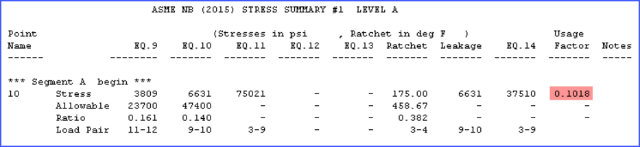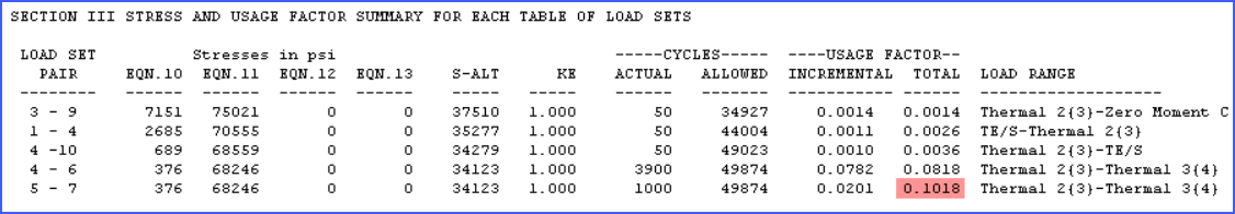 The final cumulative usage factor from the fatigue report is added to the stress summary table as shown.