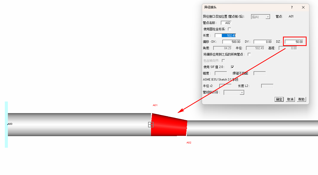 需要注意的是:在执行全局一致性检查时,AutoPIPE 会弹出警告,提示 A01 和 A02 点存在 “弯折(kinks)”。这是偏心异径管模型的固有特性(软件简化了过渡段的几何表达),实际工程中偏心异径管是平滑过渡的,因此该警告可忽略。
