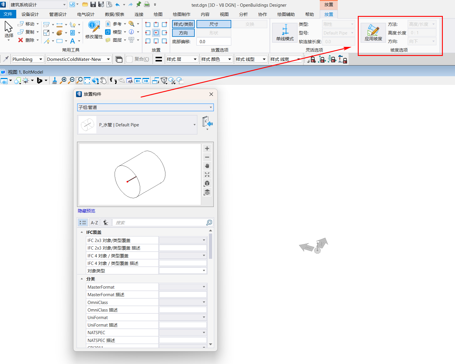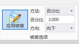 2.点击“应用坡度”按钮,在右侧输入坡度的计算方法和值以及方向,在当前视图中放置管道时,生成的管道会应用您当前设置的坡度。