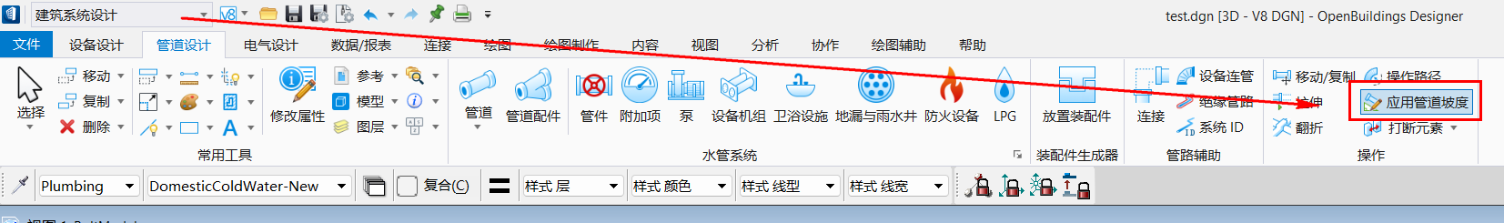 在OBD中我们提供了管道的坡度选项,我们可以使用此功能对管道进行坡度的应用和修改。具体步骤如下: