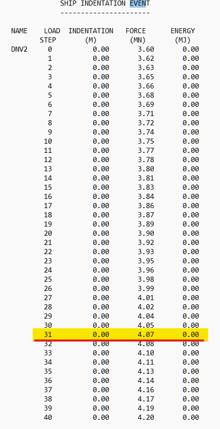 Then, you need to compare the transferred force with the minimum force needed to trigger the ship intention; for this, you need to look for the report of SHIP INDENTATION EVENT and review the force reported. As you can see on this case, until step 31 when 100% of energy is absorbed (Impact load applied in 40 steps), The energy has been absorbed by the deflection of the element, and no indentation has been presented due to the force is not sufficiently high or the structure doesn't have the enough rigidity to trigger ship indentation.