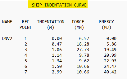 First of all, there we need to be sure that the force is sufficient to trigger the indentation on element and ship; there is no way to see ship energy absorption if the transfer load turns out to be too small in comparison with the parameter of the indentation curve. for which you need to look for the table of indentation curves in the output file which depends on the indentation curse set in the input file