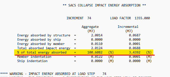 Hello Bentley, I'm carrying out ship impact analysis with SACS Collapse and trying to share the impact energy between structure, ship and member. However, I have added the DNV2 option and indentation curve in IMPACT line, but the Ship Energy Absorbed is still zero. Could I know what is missing in my collapse input file that I cannot share the energy to ship?
