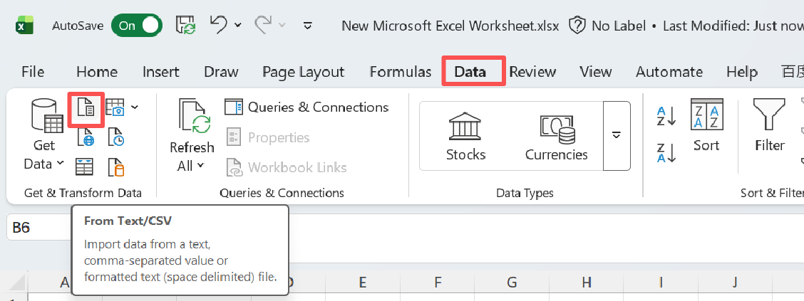 - 点击顶部菜单 “数据” → “从文本/CSV”(在“获取和转换数据”组里)。