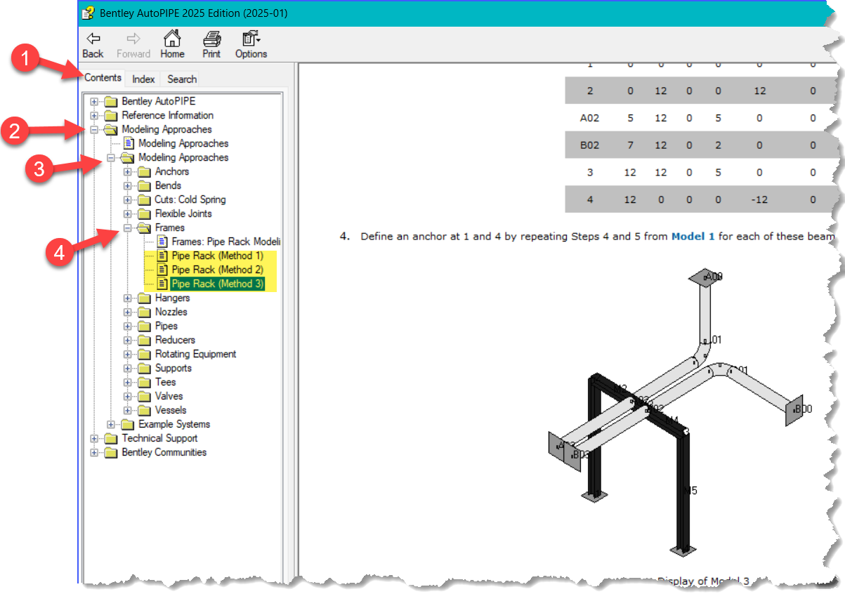 When modeling support frame structures, each disconnected piping system (for example, Gas 1, Gas 2, Fluid 1, etc.) may have their its own independent beam structure. Or, two or more disconnected piping systems can share the same beam structure (see AutoPIPE Help for details).
