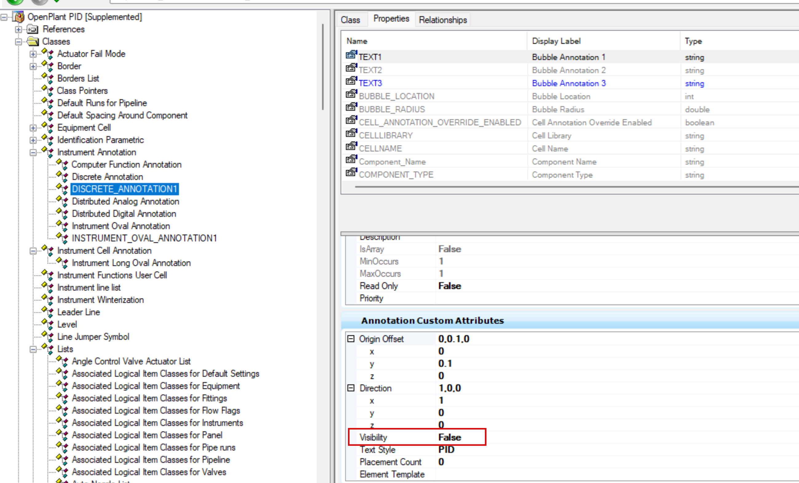 6、导航到 DISCRETE_ANNOTATION1 为例,切换到 Properties 选择 TEXT1 然后点击 Override,修改 Visibility 为 False
