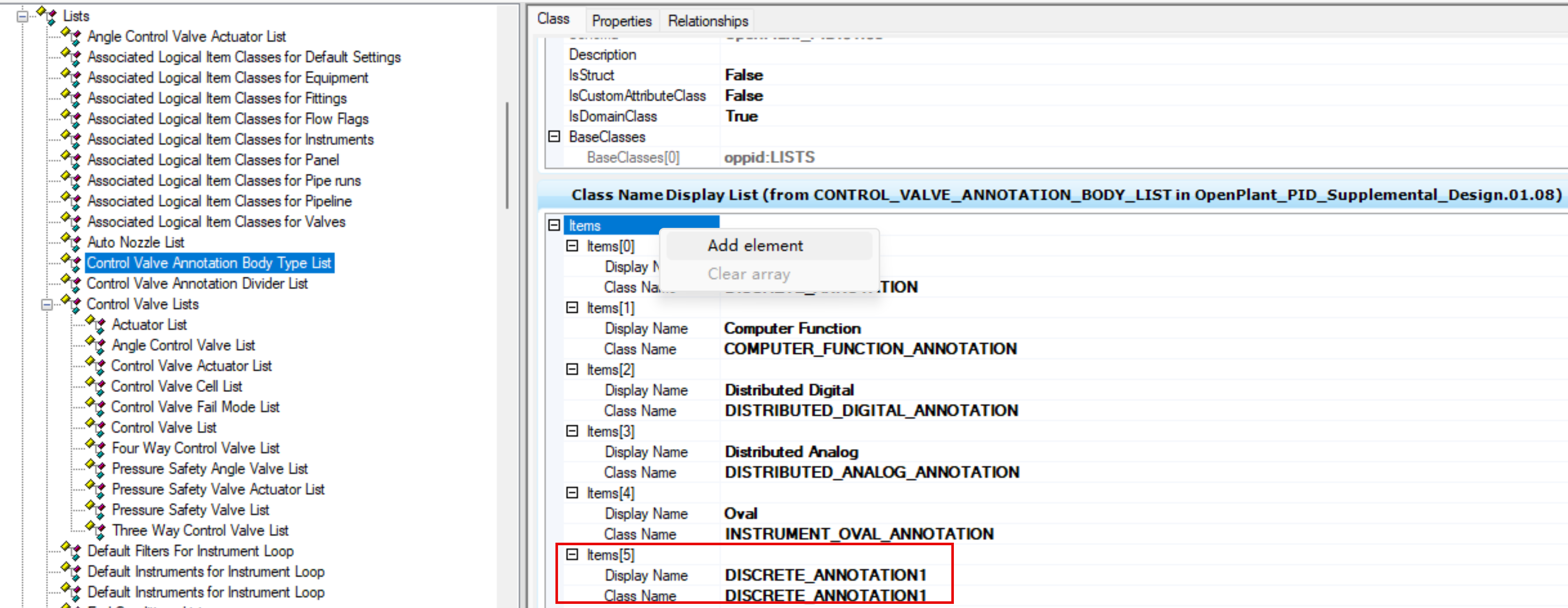 导航到 CONTROL_VALVE_ANNOTATION_BODY_LIST,点击 Items 右键 Add Element,将新创建的仪表注释类添加到对应位置,见下图: