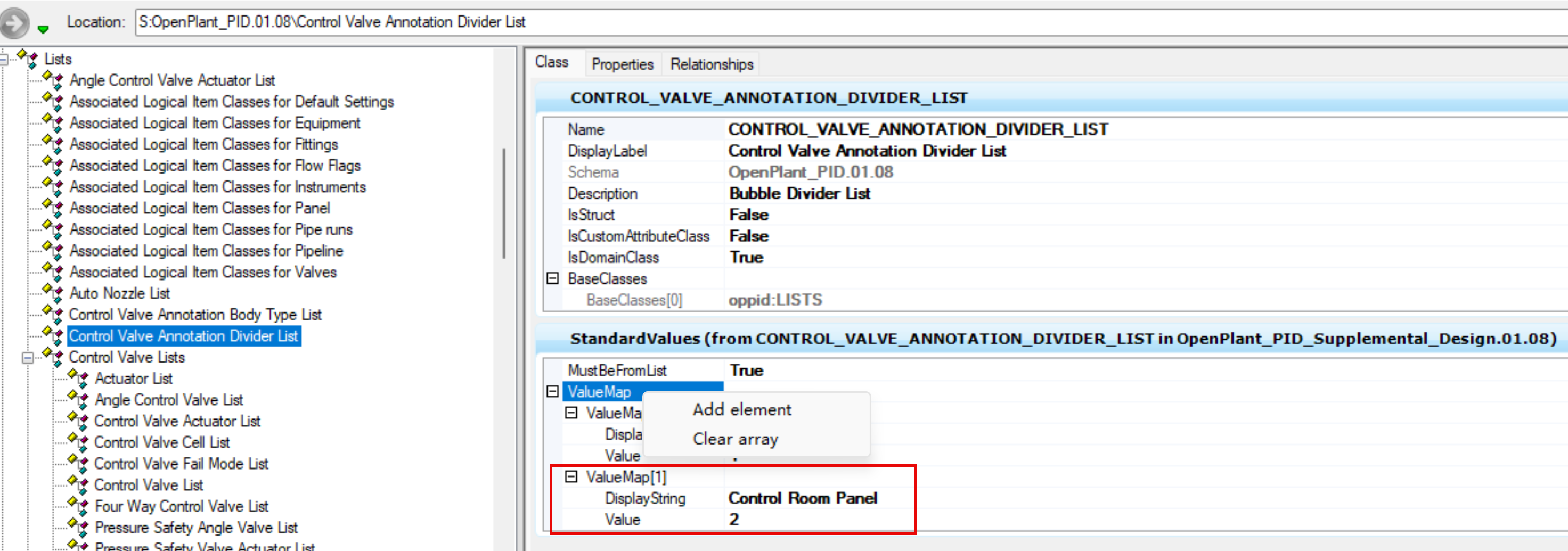 导航到 CONTROL_VALVE_ANNOTATION_DIVIDER_LIST,点击 ValueMap 右键 Add Element,将需要添加的 Divider 添加到如下位置,见下图: