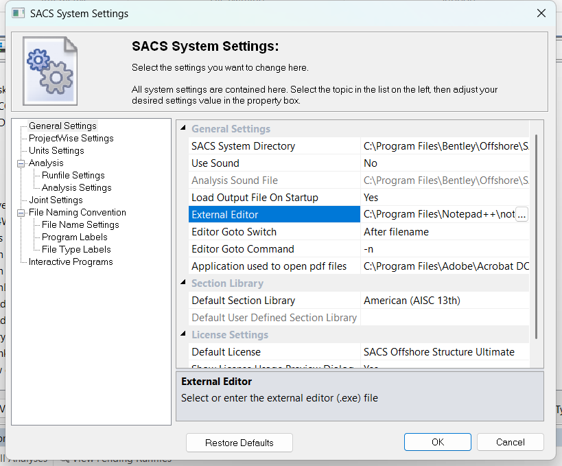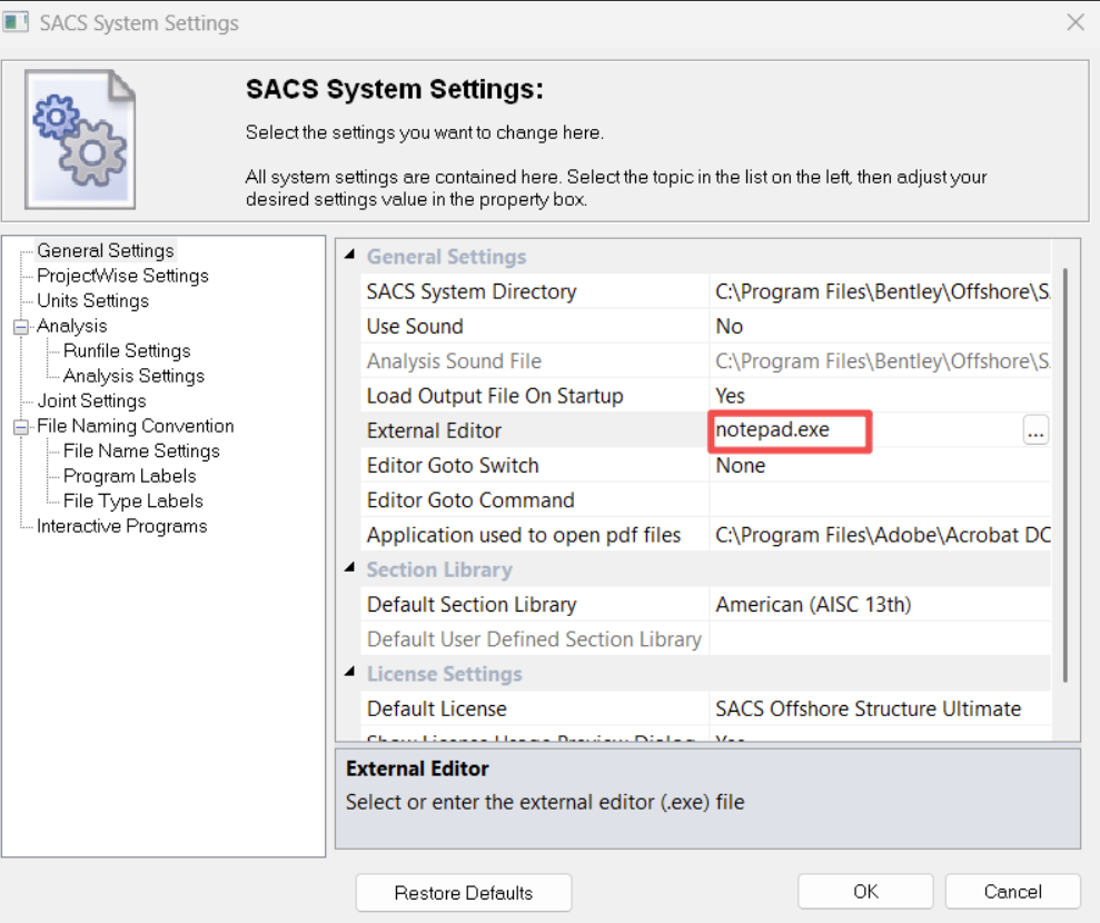 在最新的 SACS 2025(以及从 V23 开始的版本)中,安装后的默认的系统设置里外部编辑器(External Editor)会指向 Windows 自带的 notepad.exe(记事本)。