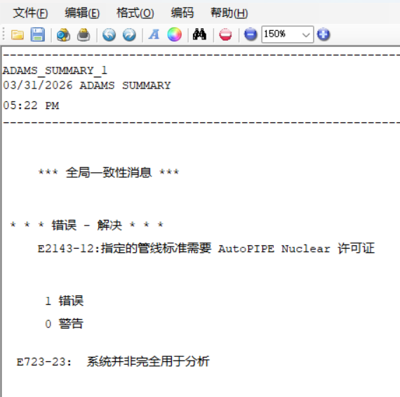 当我们在AutoPIPE中打开某个项目文件时,会弹出如下错误,同时打开文件后会在日志中显示“E2143-12:指定的管线标准需要 AutoPIPE Nuclear 许可证 ” 我们该如何解决?