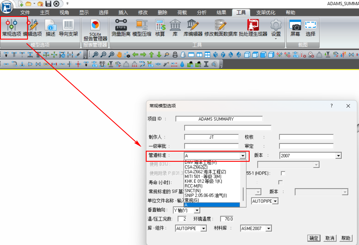 2.如果没有更高级的权限,我们就只能在打开此文件后,在“常规模型选项中”修改管道标准,但这会导致AutoPIPE Nuclear相关的所有应用设置都将被删除,需要检查模型以确保当前设置对于管道标准选择都是正确的。