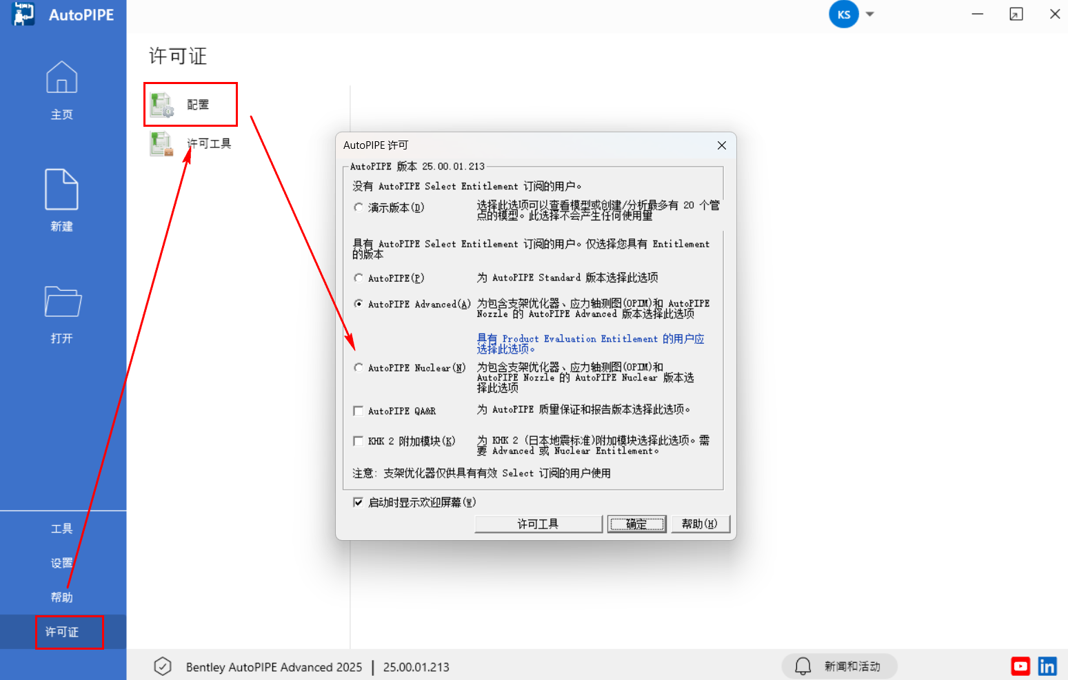1.切换我们的授权,在开始界面点击“许可证-配置”来修改授权,如下图所示: