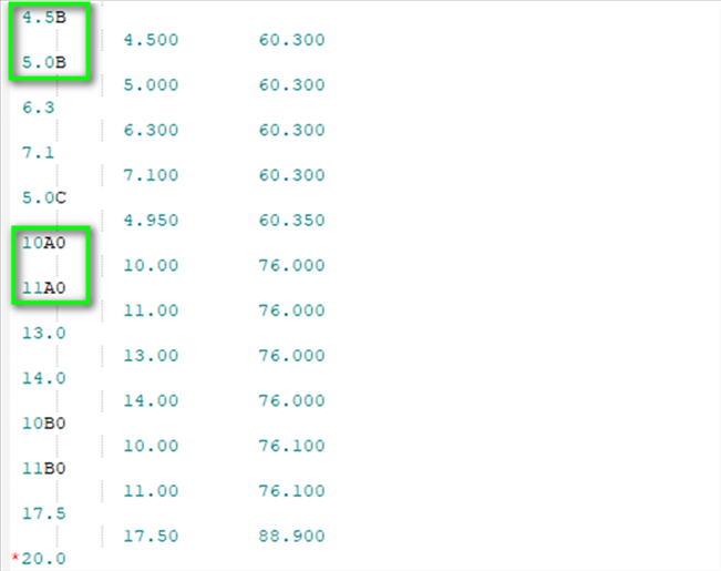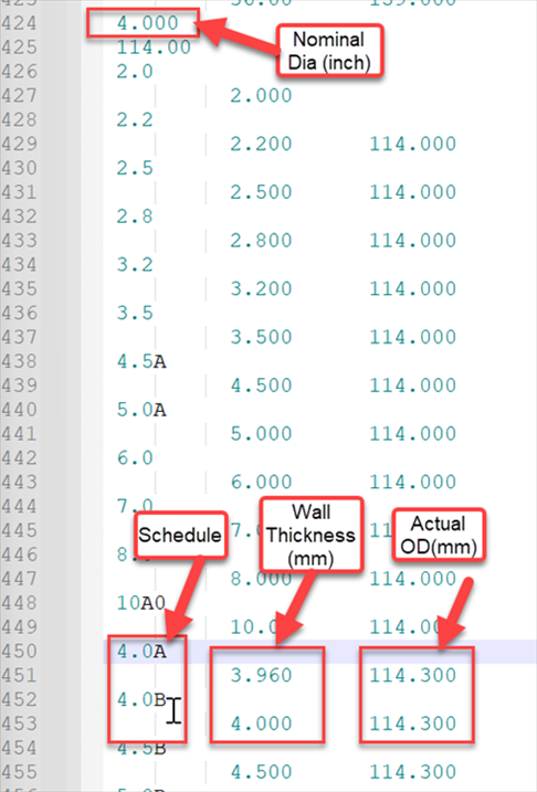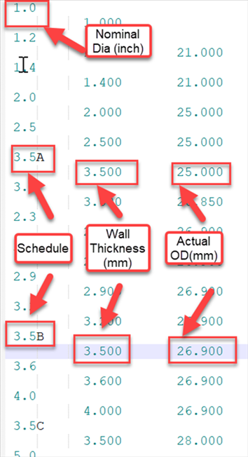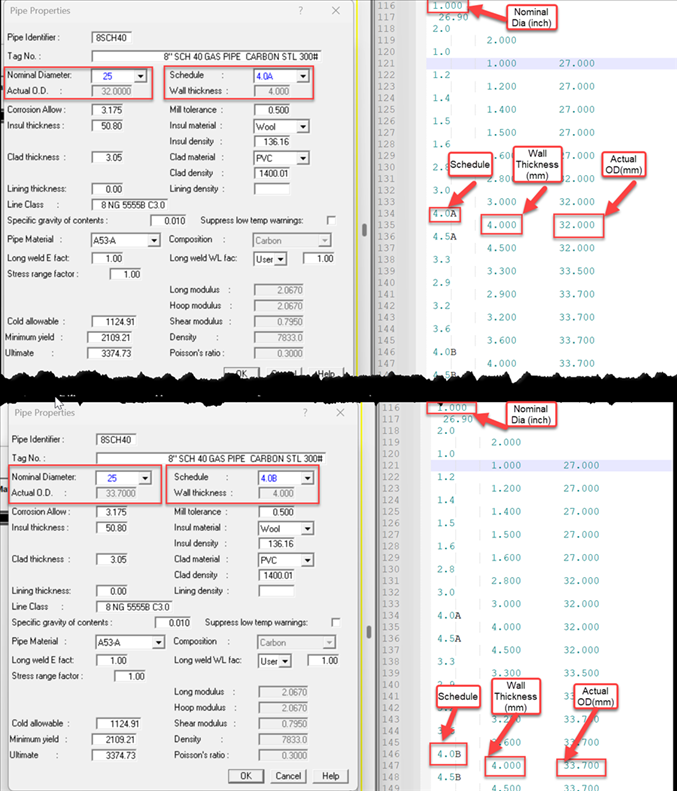 另外,我们在编辑这些公称尺寸时会发现,如果数值小于10,字母会列在数字后面。如果数值大于(等于)10,字母则会放在小数点的位置。这仅仅是工程师在设计时认为合适的一种表示方式。但是,当您编辑和创建新库时,请保持相同的格式。否则,该库将无法导入到 AutoPIPE 中。下图为库中数据与软件中参数的对比图: