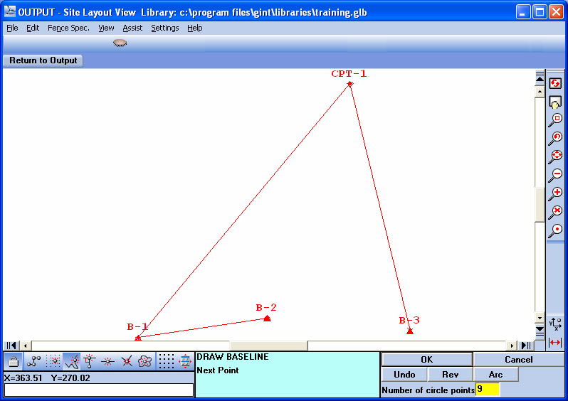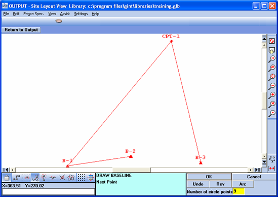 Click on the four points one at time in the order indicated above. A polyline is drawn with boreholes at the vertices.