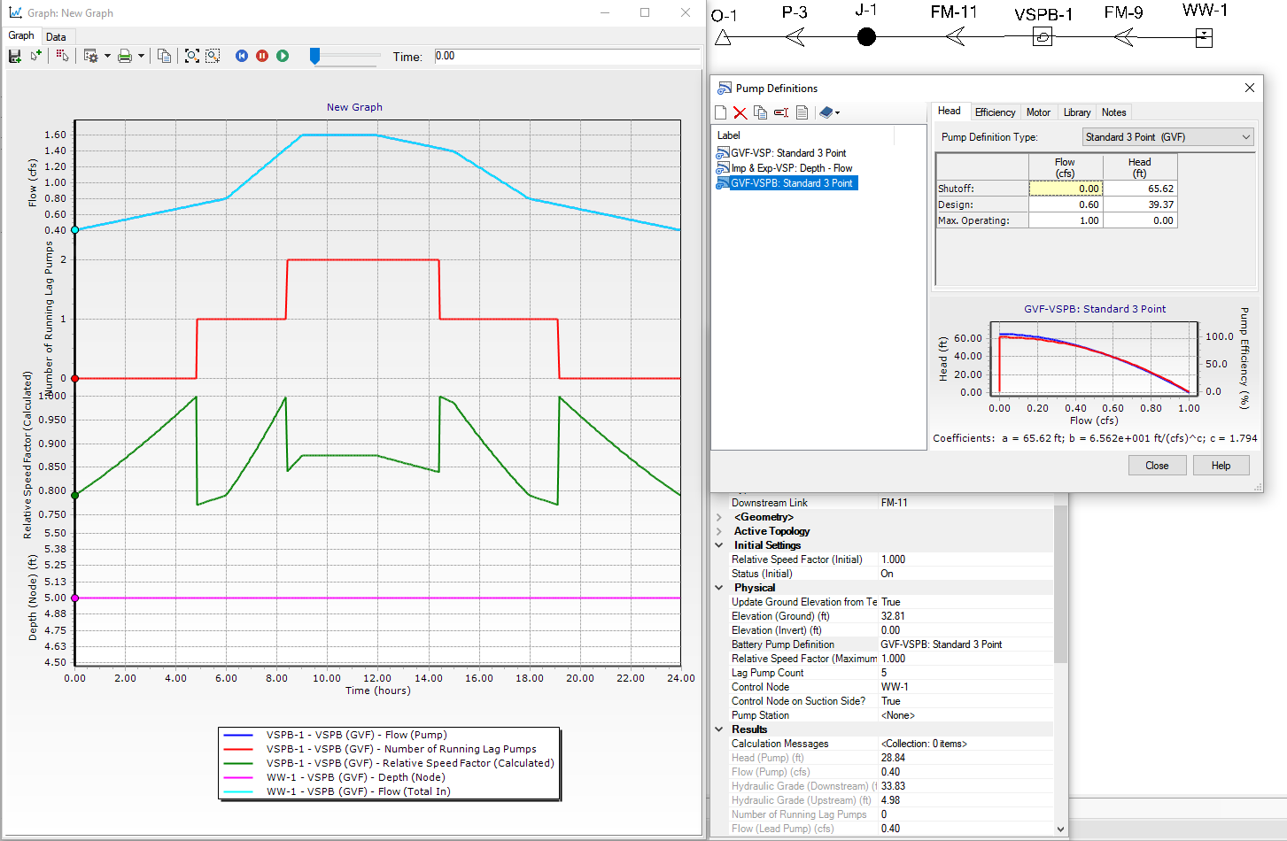 The GVF-Convex solver will not only determine the flow from the pump but will also calculate the pump's speed, such that the target is met. It is also possible to set the speed as a function of time (VSP Type = Pattern Based) to calculate the flow and head given the speed, or alternatively specify a known flow (VSP Type = Fixed Flow) to calculate speed and head. Usually one pump in a station is run as a variable speed pump. When there are more than one running in parallel, the Variable Speed Pump Battery element should be used (see below).