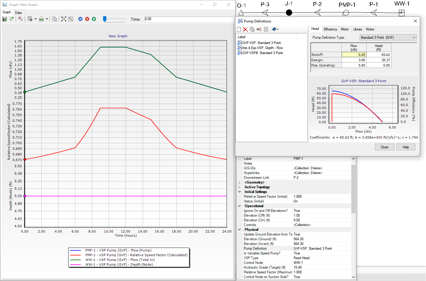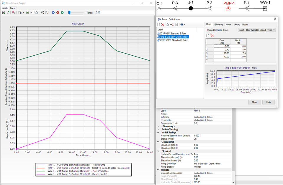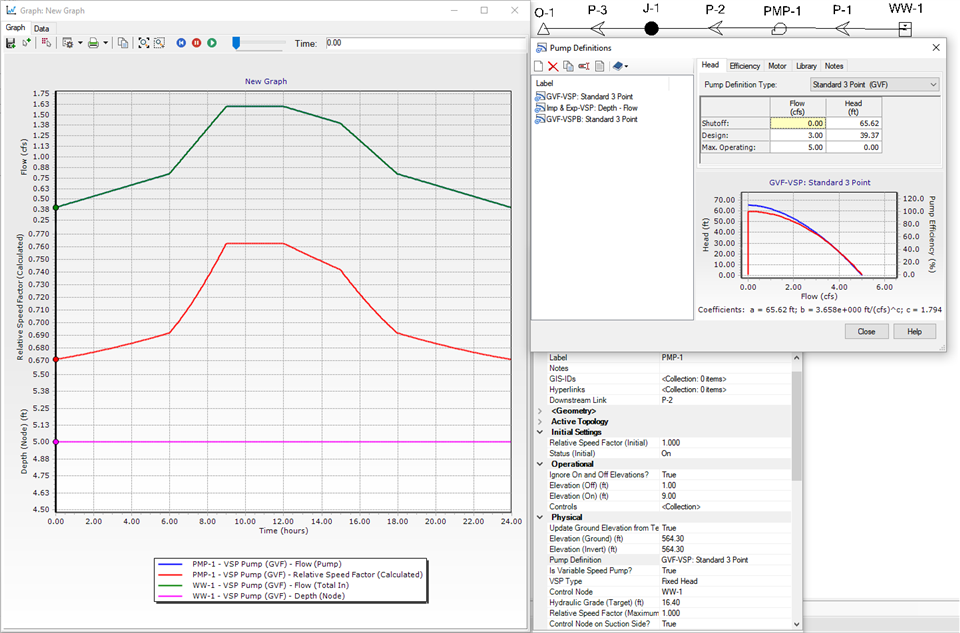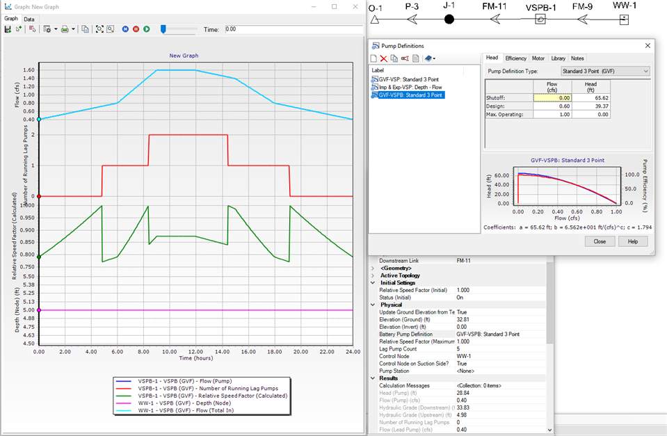 For the GVF-convex solver, variable speed pumps are solved with a true, pressure solver; the same solver used in WaterCAD and WaterGEMS. So, much of the content in this article also applies. You would create a pump definition corresponding to the full speed pump and assign that definition to a pump element. The definition could be any of those for pressure elements including 1-pont, 3-point, multipoint, standard extended and custom extended.