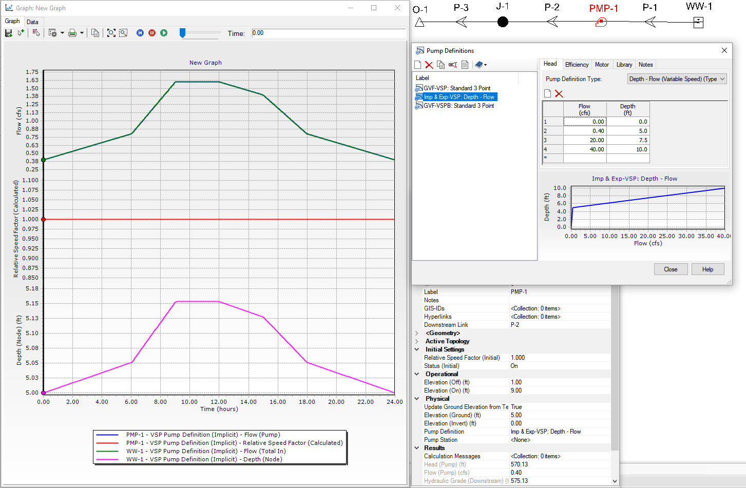 With the Implicit and Explicit (SWMM) solvers, which solve the full St. Venant dynamic equations, the discharge from the pumps is represented as a function relating flow rate from the pump to the water level in the adjacent wet well. Usually the function should span the full range of water levels in the wet well such that when the wet well is empty, the flow should be zero while if the wet well is full, it should be the maximum flow that the pumps can deliver. When the wet well is at its typical level, the flow should roughly match the average inflow to the wet well. These solvers do not directly use the pump head characteristic curve, nor will they determine the actual pump speed. Under the Components > Pump Definitions, this type of pump is referred to as a "Depth flow (Simulated Variable Speed Pump)", which is sometimes called a "SWMM Type 4" pump.
