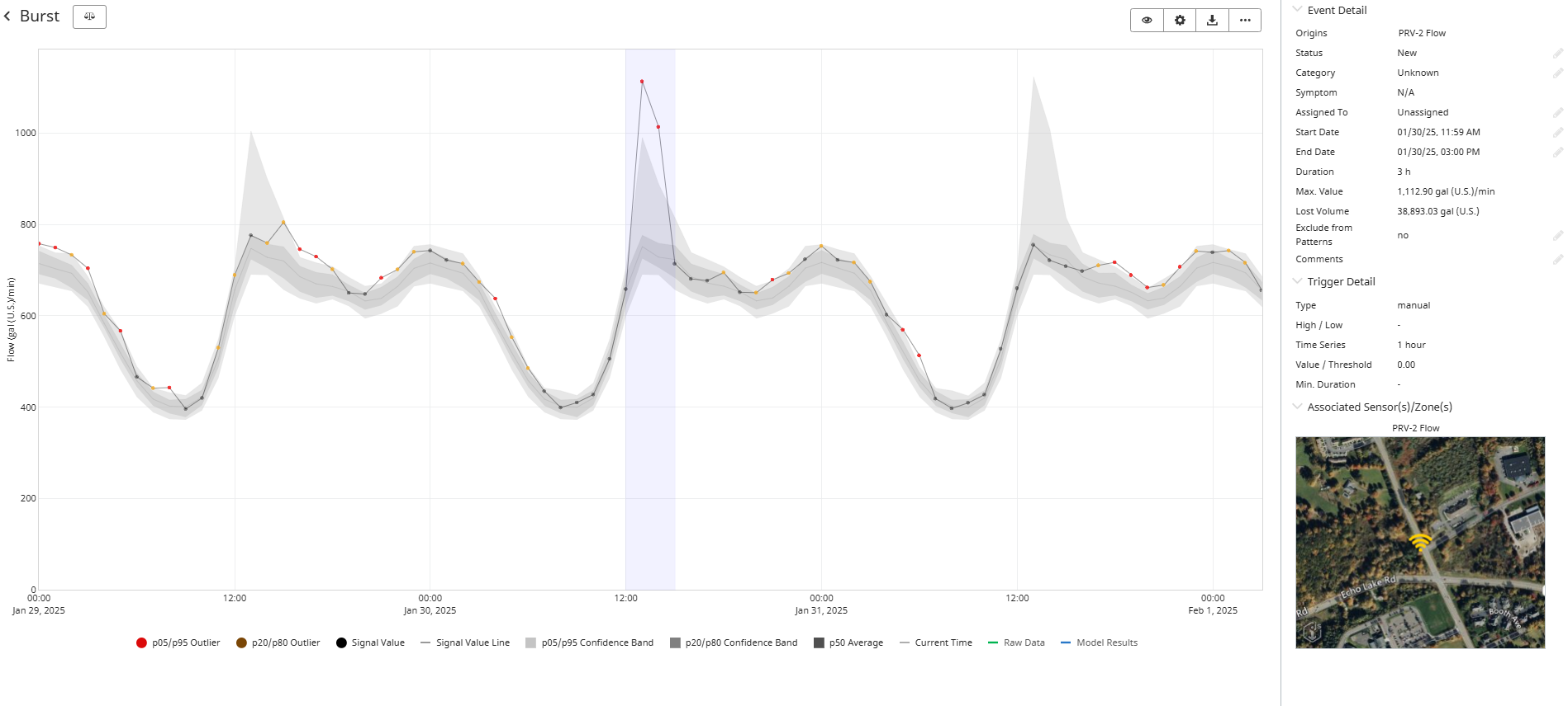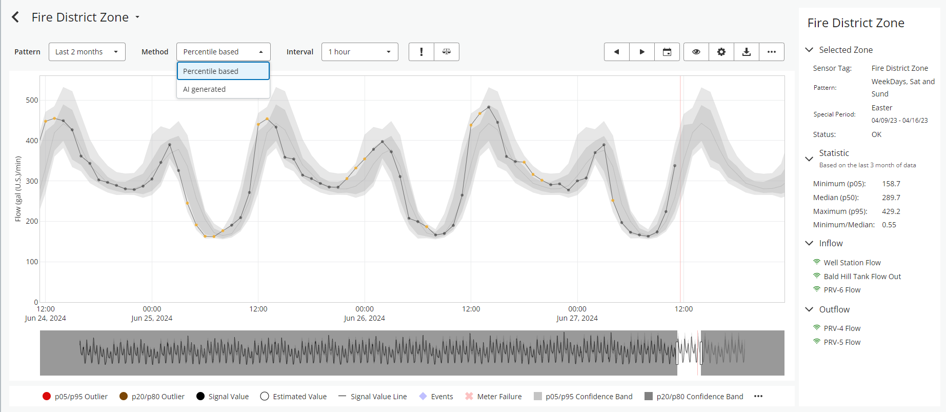 Real time data: Real (re-sampled) values are represented as a black, red or orange circles. Those real (re-sampled) values are calculated based on the final balance between all inflows and outflows (plus accounting for storage inside the zone if exists). Whenever real data (re-sampled) goes outside the pattern confidence bands (above percentile 95 or below percentile 5 of the pattern), an outlier is identified and the value is color coded with a red circle.