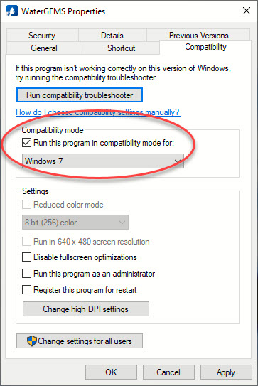 If the product will not launch, right-click on the program's executable file (C:\Program Files(x86)\Bentley\WaterGEMS\WaterGEMS.exe for WaterGEMS) and look at the Properties dialog. There should be a "Compatibility" tab and in that tab, set Compatibility Mode to Windows 7 or Windows 8.