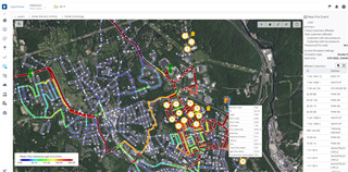 Syde by side view will only be available for emergency events that were created in the last 7 days. If side-by-side view option is on, it will be possible to easily compare the baseline scenario (with no event) with the event scenario. User can click in any element in the map to see the results for a specifc element and compare pre and post event conditions. Graph result will only be available if the event simulation run is Extended Period type, please see below for more information.