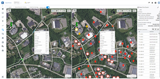 Map automatically zoomed to the location of the event, highlighting all customers affected by the fire event, as well as flow location. Customers are represented with the following colors:
