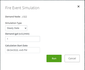 Hydraulic model engine will run in order to identify customers impacted by the flow event (customers without supply and customers with low pressure). Steady state means that the period analyzed corresponds only to the exact instant when the fire is happening with the specified flow for the specified instant (defined by the user). In that case, above the simulate button, it will be displayed Steady state as simulation type.