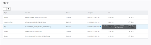 In case a shapefile is already uploaded and the user wants to upload a new one, the user should click on the “Edit” symbol located on the right , and directly upload a new Zip file containing the new pipe shapefiles.