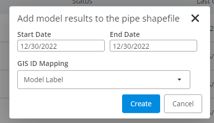 After defining a time period and the mapping and clicking in the "Create" button, and after the process has run, an information symbol with a tooltip will get displayed, with the information that model results were appended to the pipe shapefile and the respective time period that was used (example below). In addition to this, automatically these results will be available inside the capital planning module. More information about how to use the added model results statistics within WaterSight, please click here.