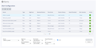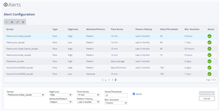 Bursts alerts can also be configured and triggered based on a decrease in pressure (in relation to a pattern) and assigned to the individual sensor. However in some cases it is more likely that a burst will cause a more significant increase in the flow than a significant decrease in the pressure, as several systems are running with oversized pipes (pressure change/head loss also depends on pipes diameters).