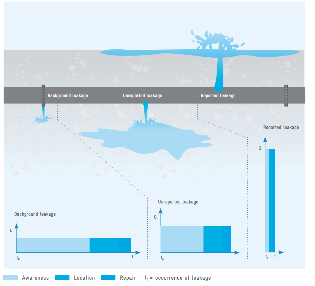 Leakage can come from transmission and distribution mains – pipes, junctions or valves (usually have medium to high flow rates and short to medium runtimes) and from service connections (sometimes referred to as the weak points of water supply networks, because their joints and fittings exhibit high failure rates). Leaks on service connections are difficult to detect due to their comparatively low flow rates and thus often have long runtimes.