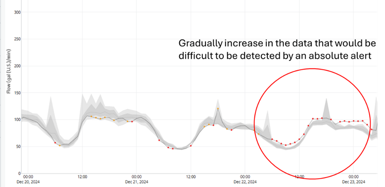Small bursts and leaks commonly occur underground and are not visible at the surface and have low flow rates and long durations. Usually are associated with small bursts or leaks, which increase in flow is usually difficult to detect by just looking at the instantaneous or 15 minutes values. For these cases, the minimum nightly flow (MNF) should be monitored and alerts should be triggered when there is an increase on these values.