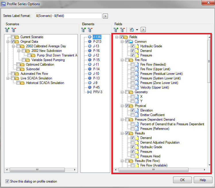 5) The next window you will see is the Profile Series Options window where you choose what scenario or scenarios you would like to display a profile before on the left side and you choose the properties of each element you'd like to display on the right side (see area in red box below). You can display results for multiple scenarios in the same profile.