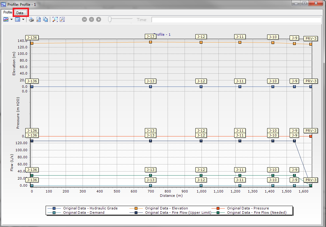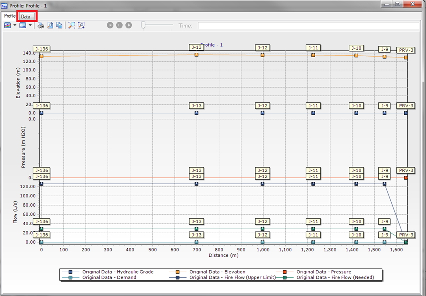 6) The last window you will see is the profile window. The y-axis of the graph displays the values of the properties that you chose from the profiles series options window while the distance between the graphed elements is displayed along the x-axis. If you'd like to know the exact value at a certain point you can click on the data tab at the top of the window to view the values (see red box in the screen shot below)
