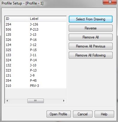 4) After you've chosen the element for your profile the profile setup window will appear with the a list of the elements you've choose. In this window you can reverse the order of the elements, remove all the elements and start over if you've made a mistake, remove all the previous elements from a choose point on the list, or remove all the elements following a chosen point on the list. After you've made whatever changes you may need to click the "Open Profile" button located at the bottom of the window.